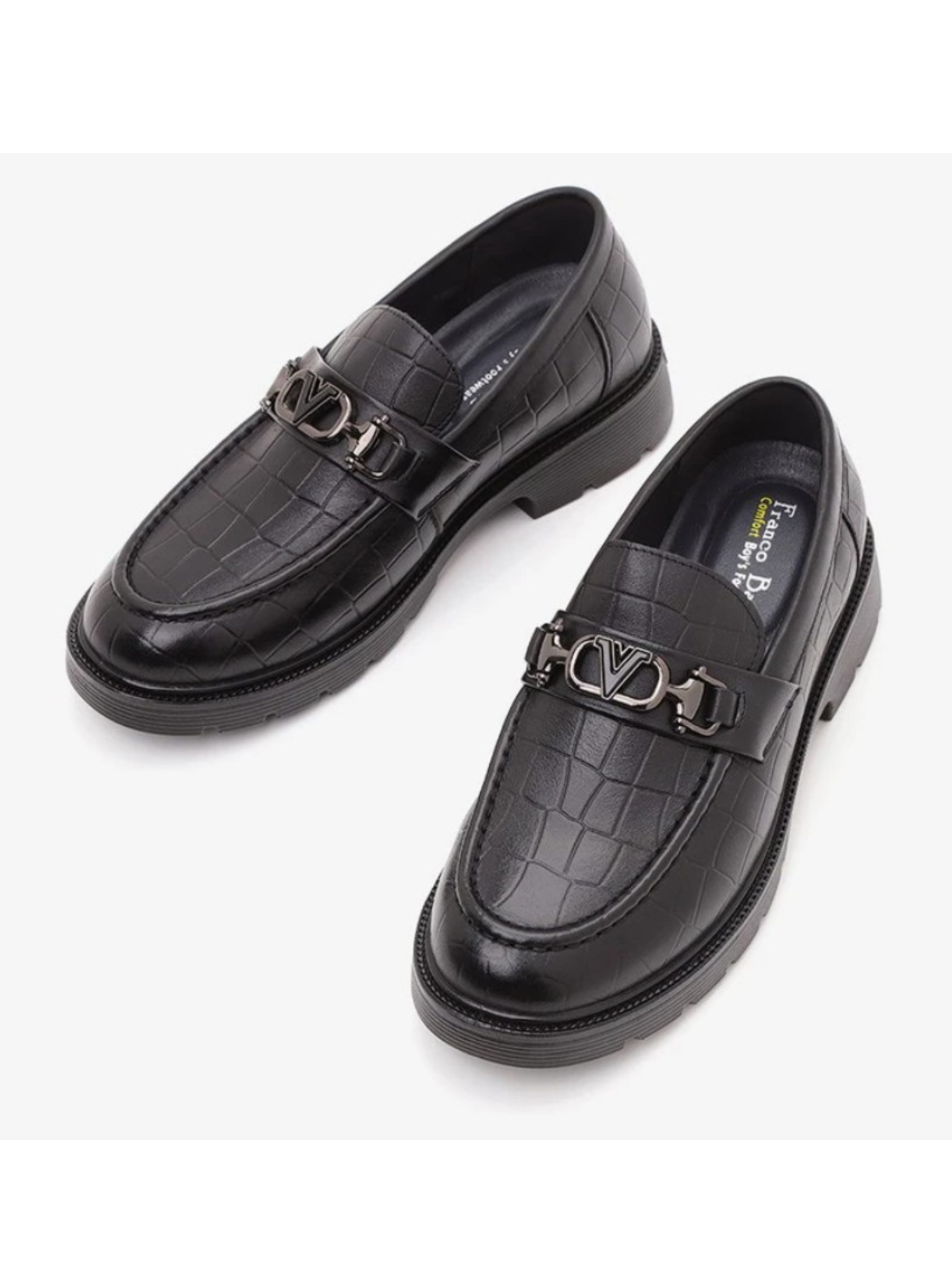 דגם 9407B מבית Franco Bane מציג עיצוב קלאסי עם טקסטורת תנין מרשימה ואבזם דקורטיבי שמשדר יוקרה ונוכחות.
