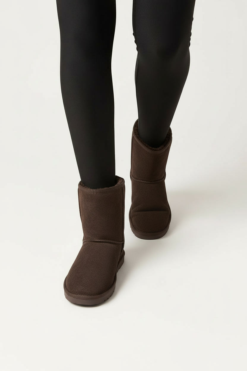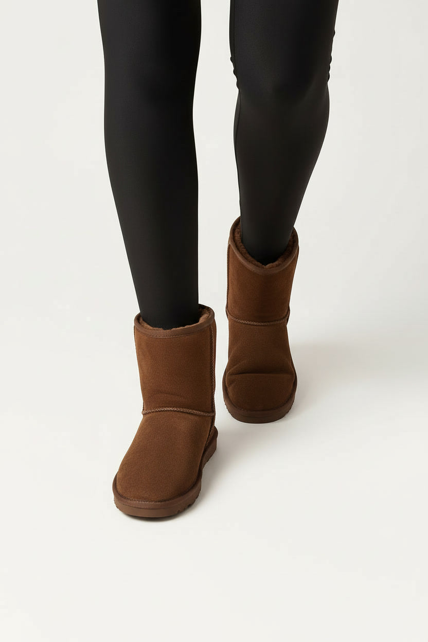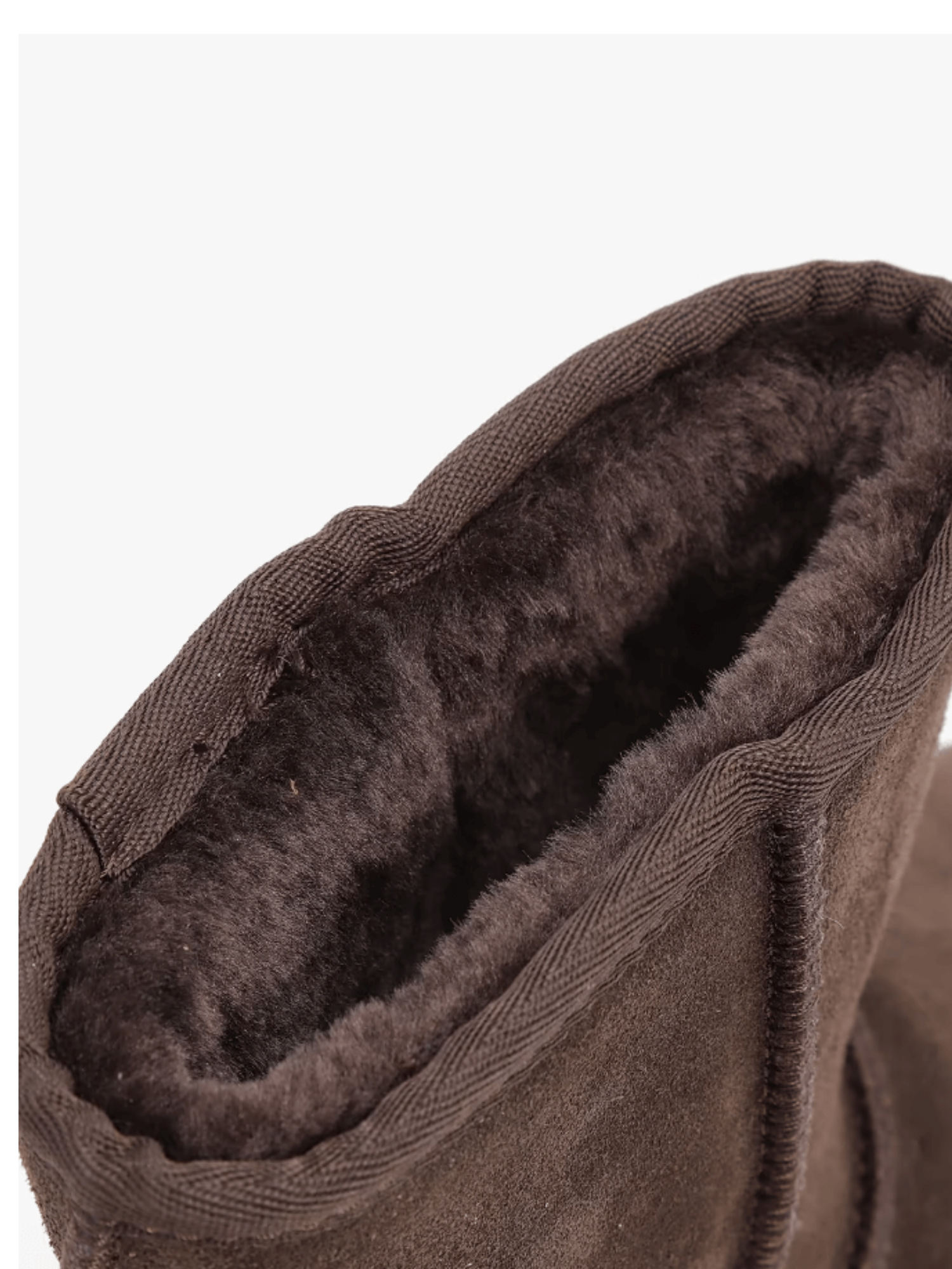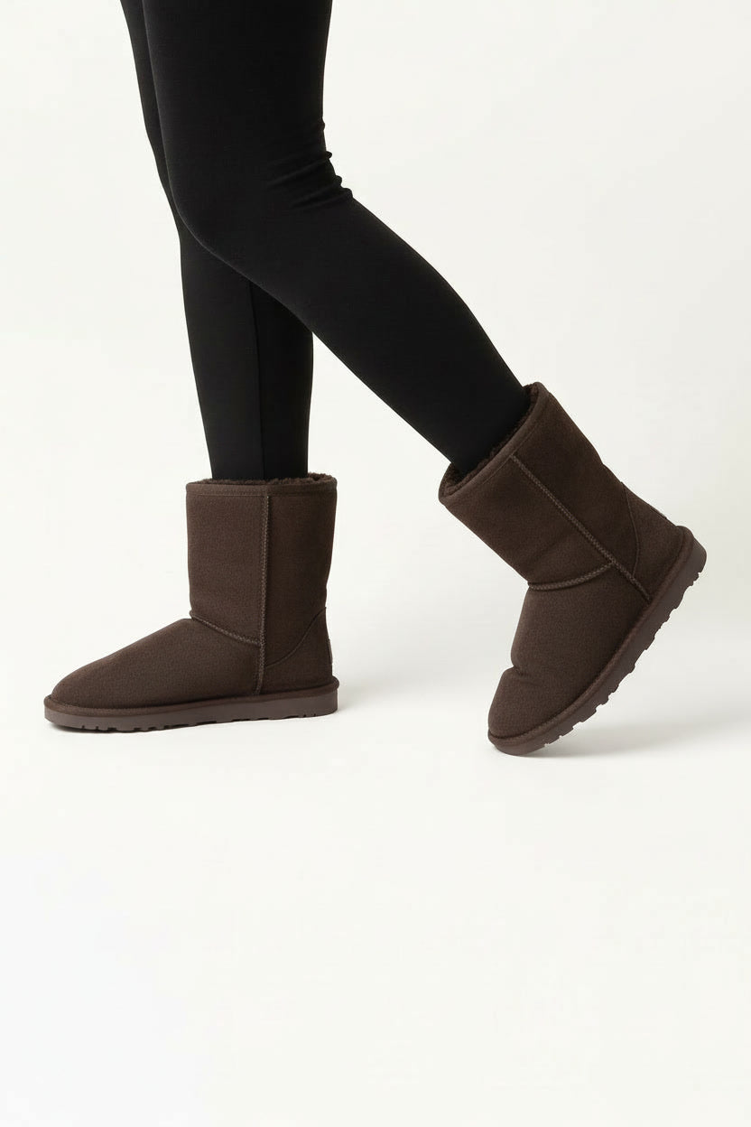 מגפי חורף קלאסיים עשויים זמש עם פרווה פנימית מחממת, תפרים עבים חיצוניים וסוליה קלת-משקל.