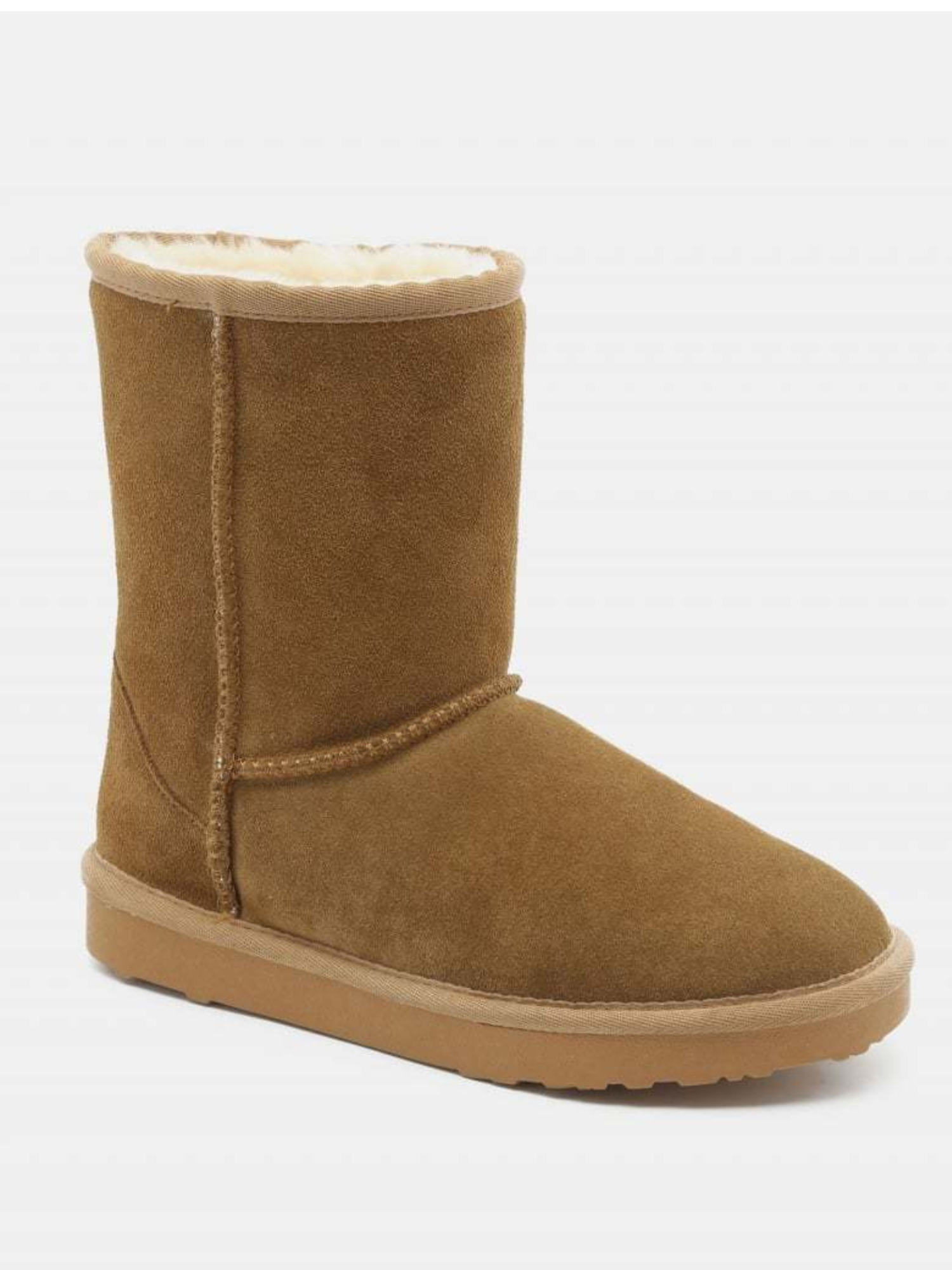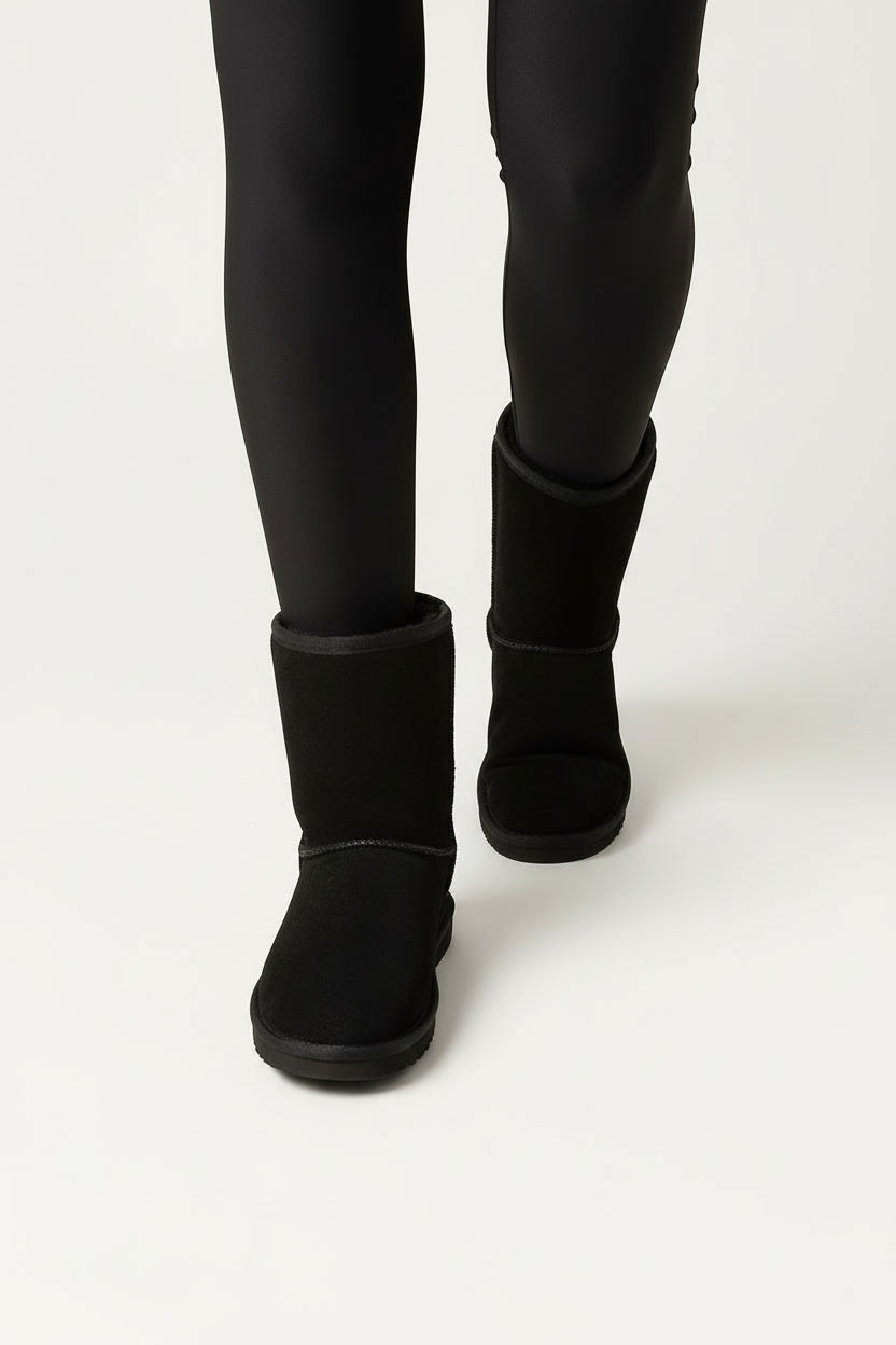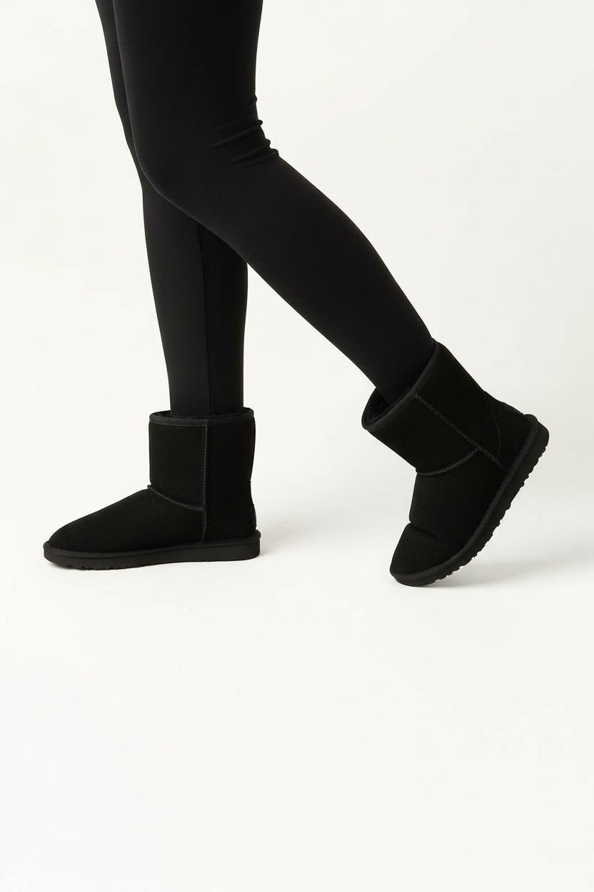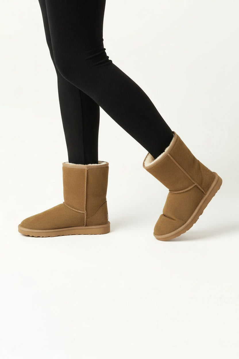 מגפי חורף קלאסיים עשויים זמש עם פרווה פנימית מחממת, תפרים עבים חיצוניים וסוליה קלת-משקל.