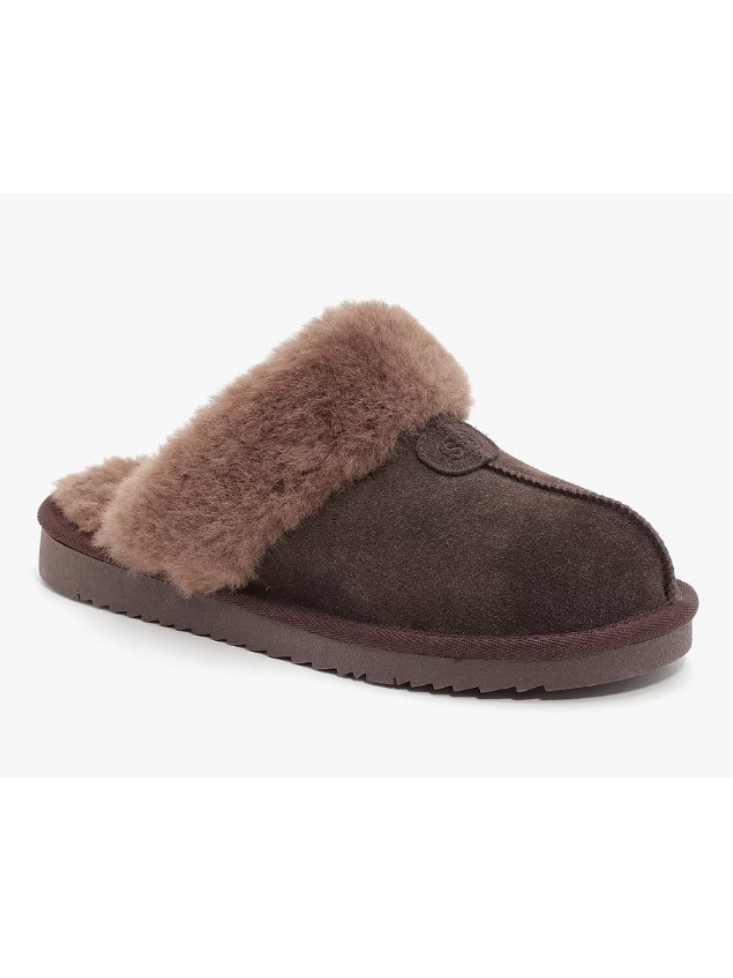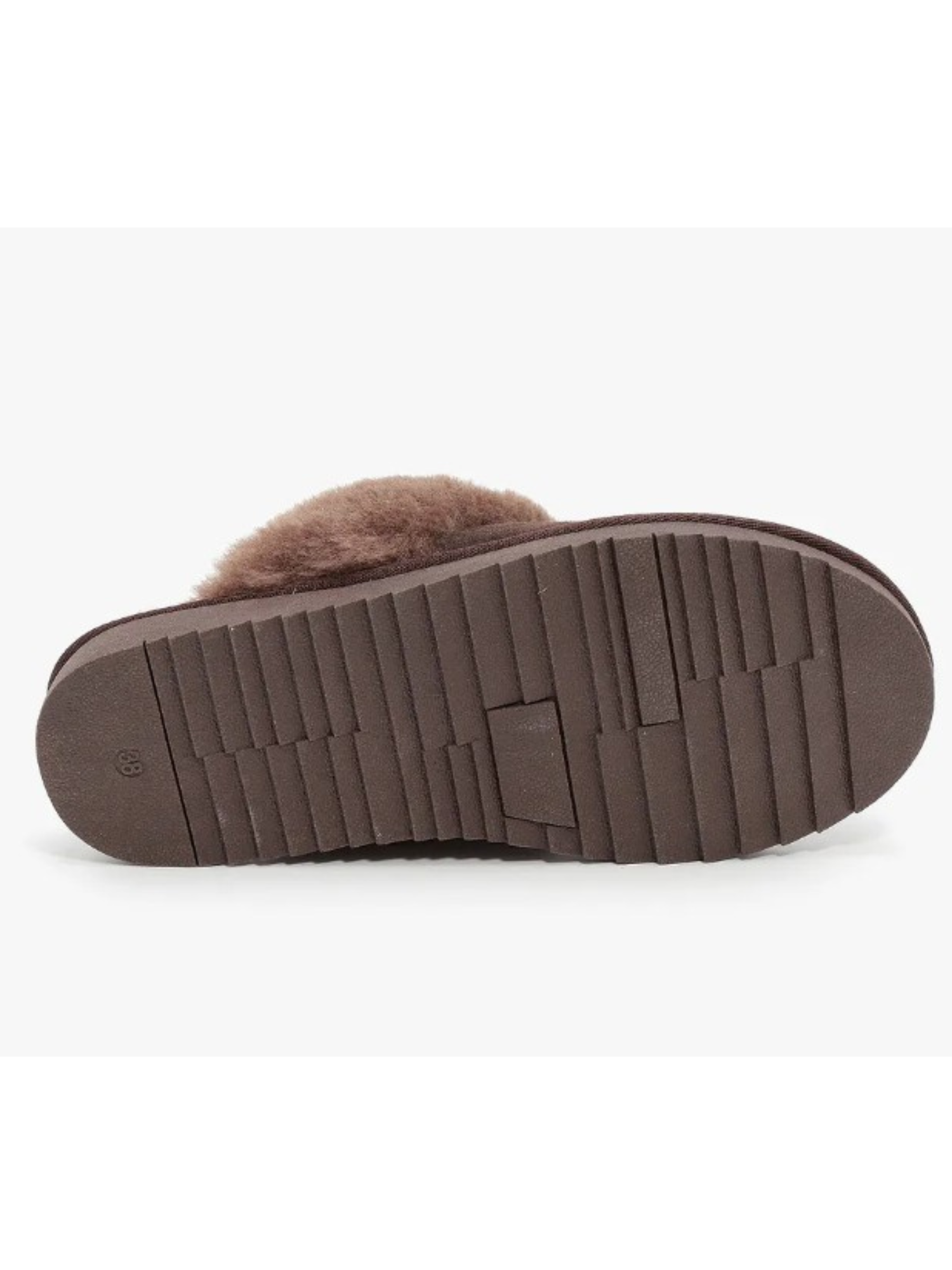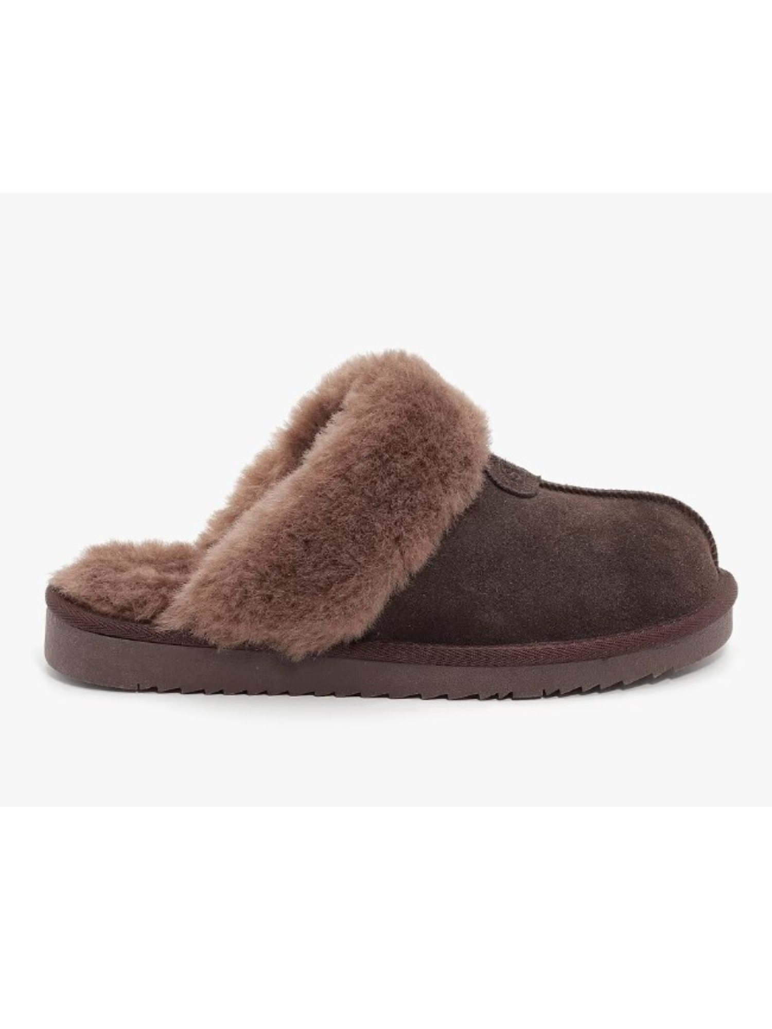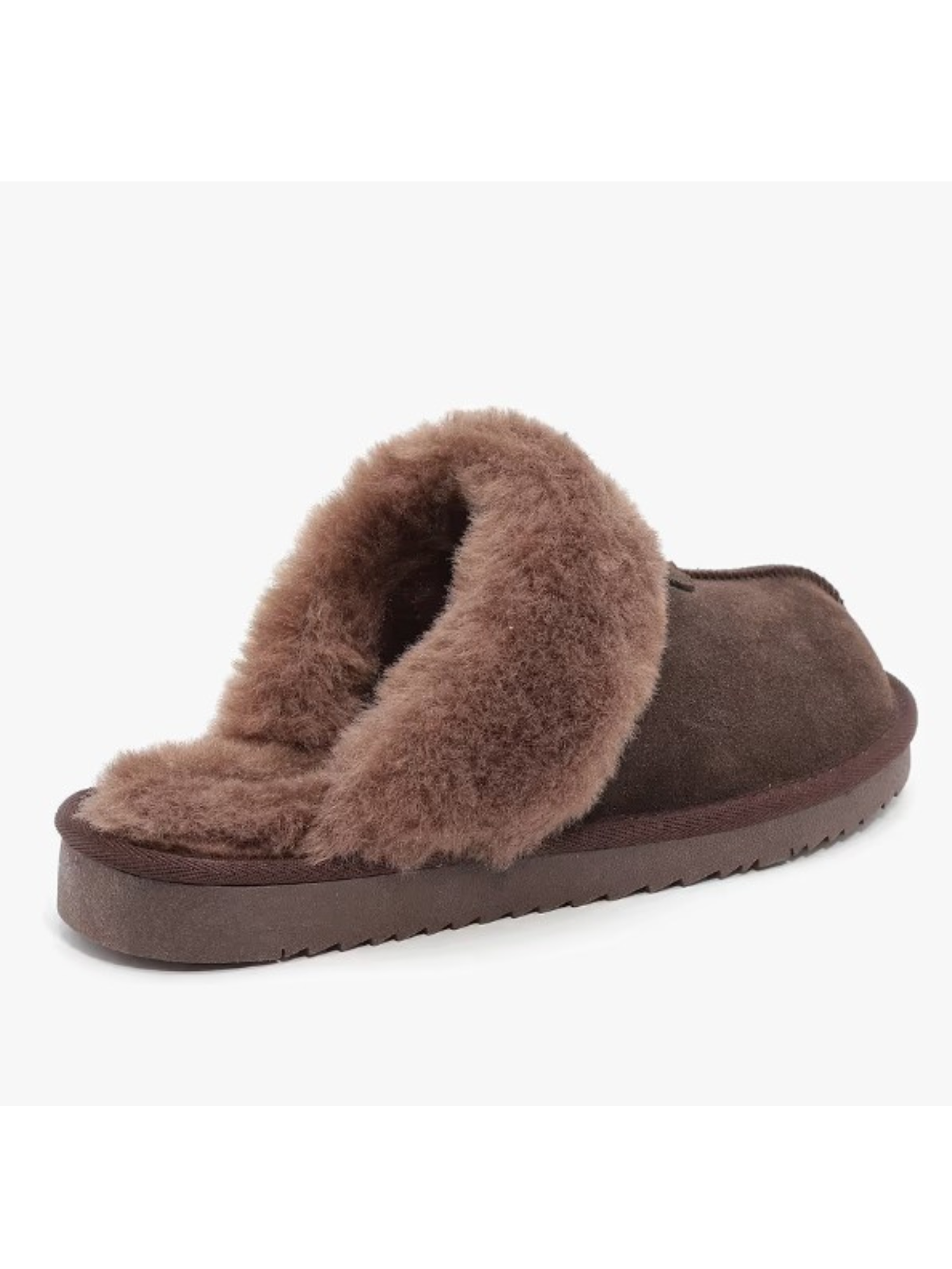 כפכפים מזמש עם בטנת פרווה רכה ונעימה לנשים. הכפכפים סגורים מקדימה באזור האצבעות, עם חרטום עגול ותפר חיצוני בולט ודקורטיבי במרכז הגפה. סוליית גומי בעובי בינוני, שמאפשרת נוחות ויציבות בכל צעד.