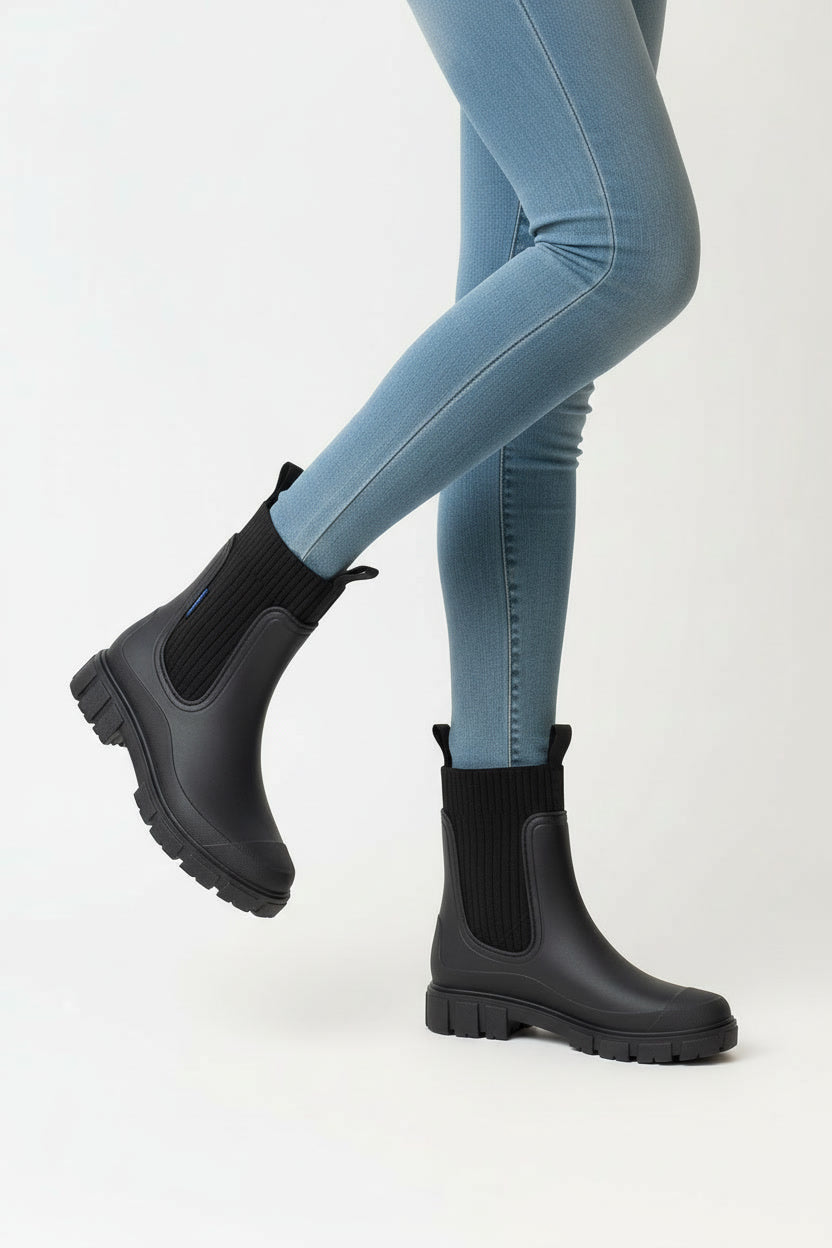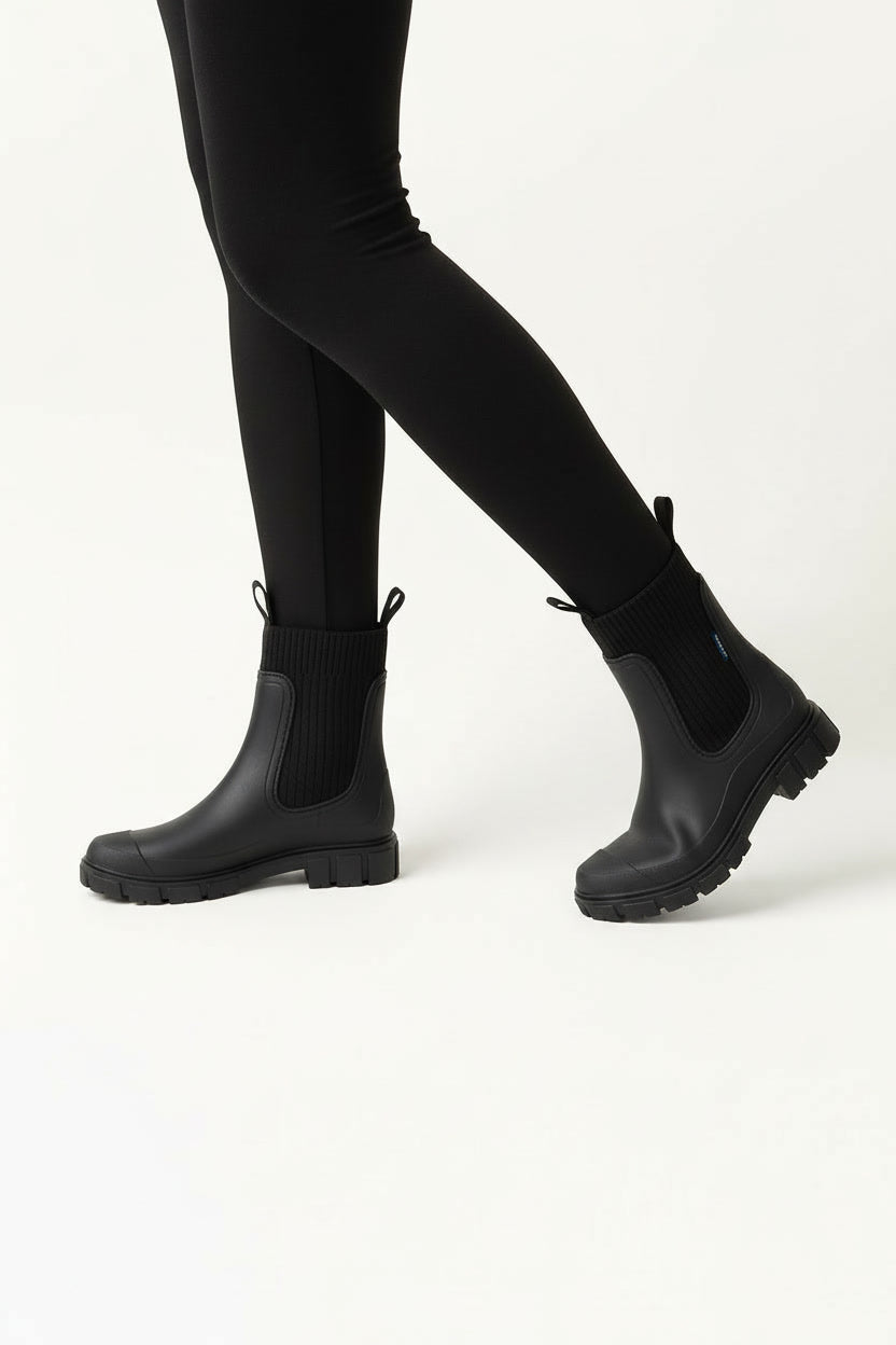 מגפונים מגומי אופנתיות אטומות למים וגשם בשילוב בד גרב . סוליה צ'אנקית . עקב נוח בגובה כ 3 ס"מ .